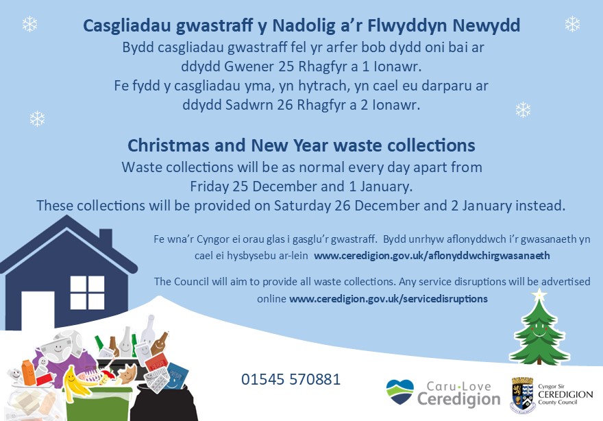 Share this: Click to share on X (Opens in new window) X Click to share on Facebook (Opens in new window) Facebook Like Loading... Related CASGLU GWASTRAFF DROS Y NADOLIG- WASTE COLLECTION OVER CHRISTMAS December 20, 2020 / clerkcommunitycouncil / Leave a comment